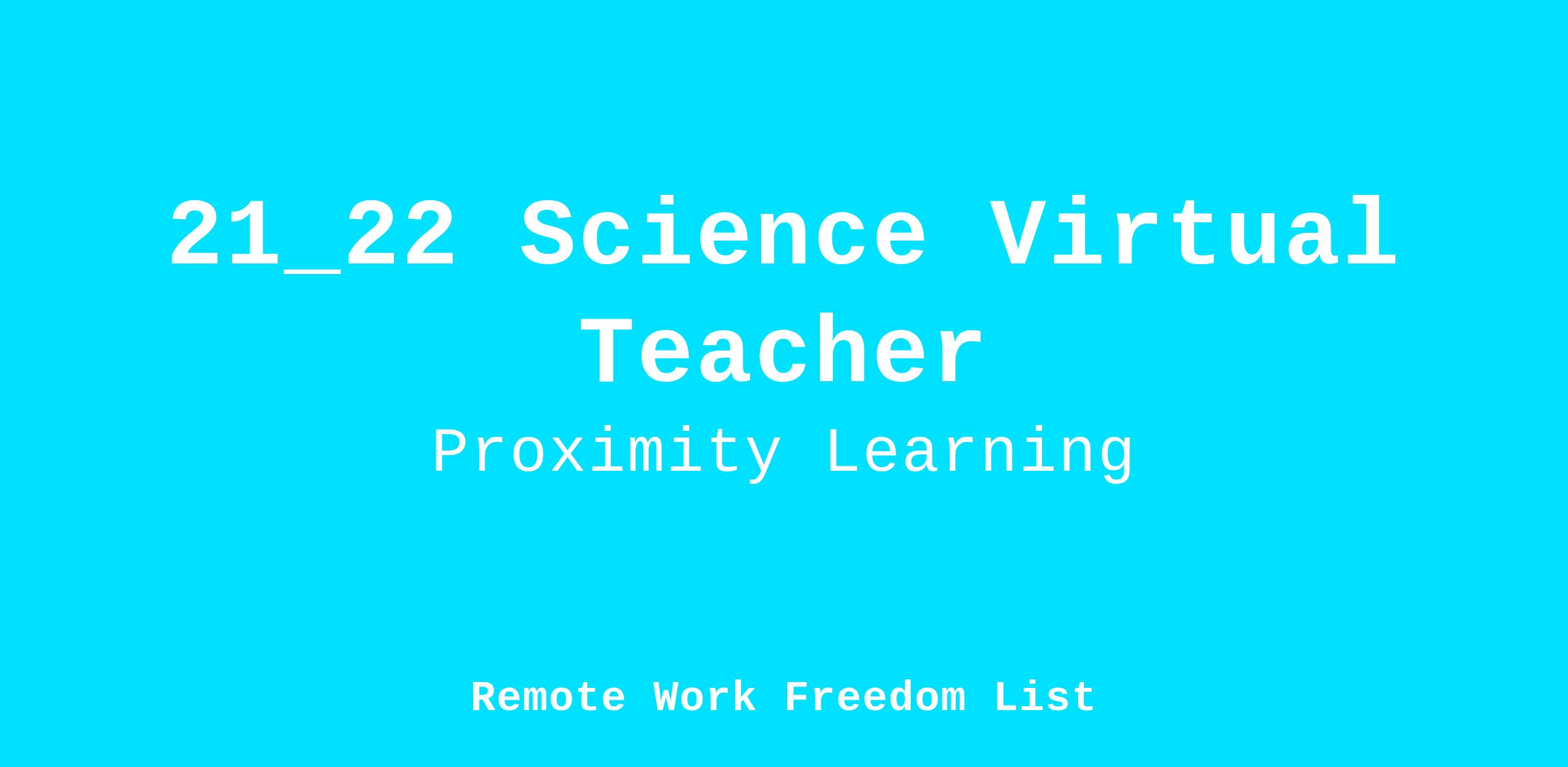 The teacher will implement an appropriate educational curriculum based on State Science Standards and the course pacing guides provided by the district. The teacher will create and maintain an educational atmosphere that encourages effective student learning. This person will report directly to the Vice Principals at Proximity Learning. Approved candidates will be placed into an active teacher pool.