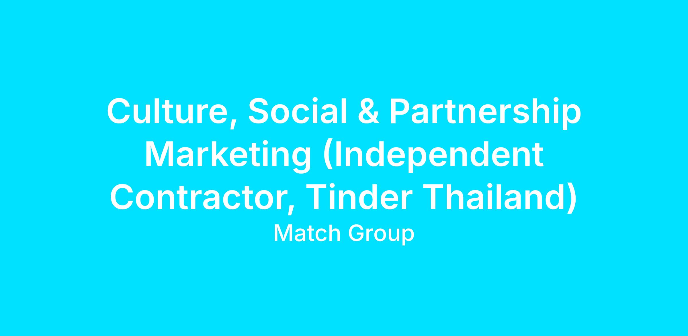 We are seeking a Culture, Social & Partnerships Contractor to collaborate with Tinder Thailand on selected marketing and partnership projects.