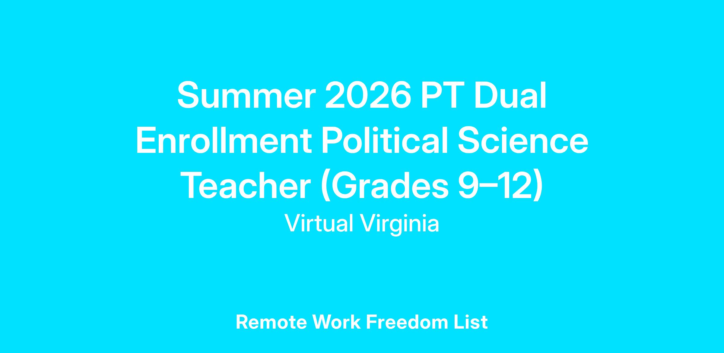 Virtual Virginia (VVA) is now accepting applications for a part time, Virginia-certified Dual Enrollment Political Science teaching position for the 2026 Summer Session, working with secondary students in Grades 11–12. This position requires a Master's Degree with a minimum 18 graduate hours in Political Science.